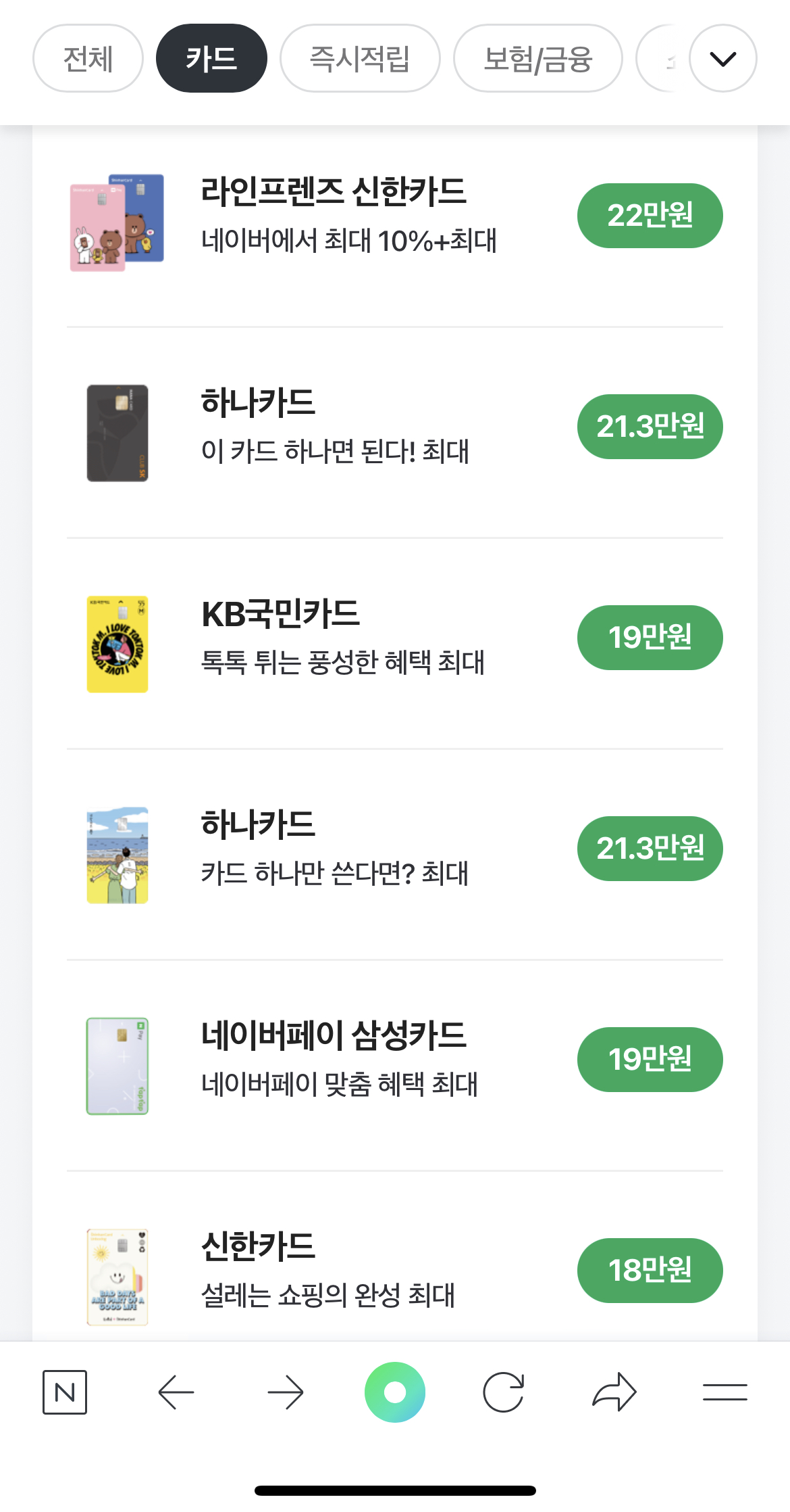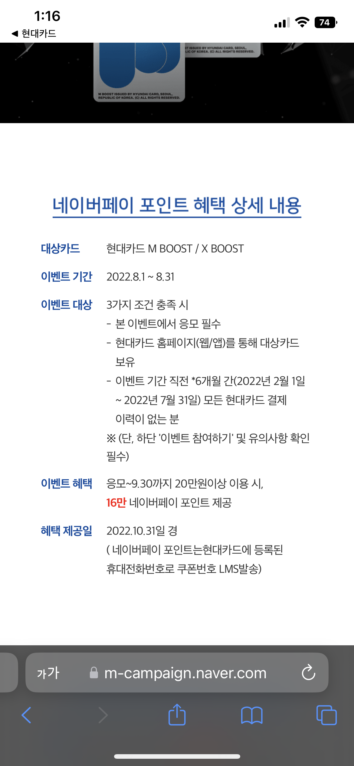 이런식으로 카드를 발급받아 기간내 얼마정도 쓰면 어느정도 포인트로 페이백해주는 이벤트가 많다. 네이버고 카카오고 현재 현대카드는 이벤트를 하고있지 않다.