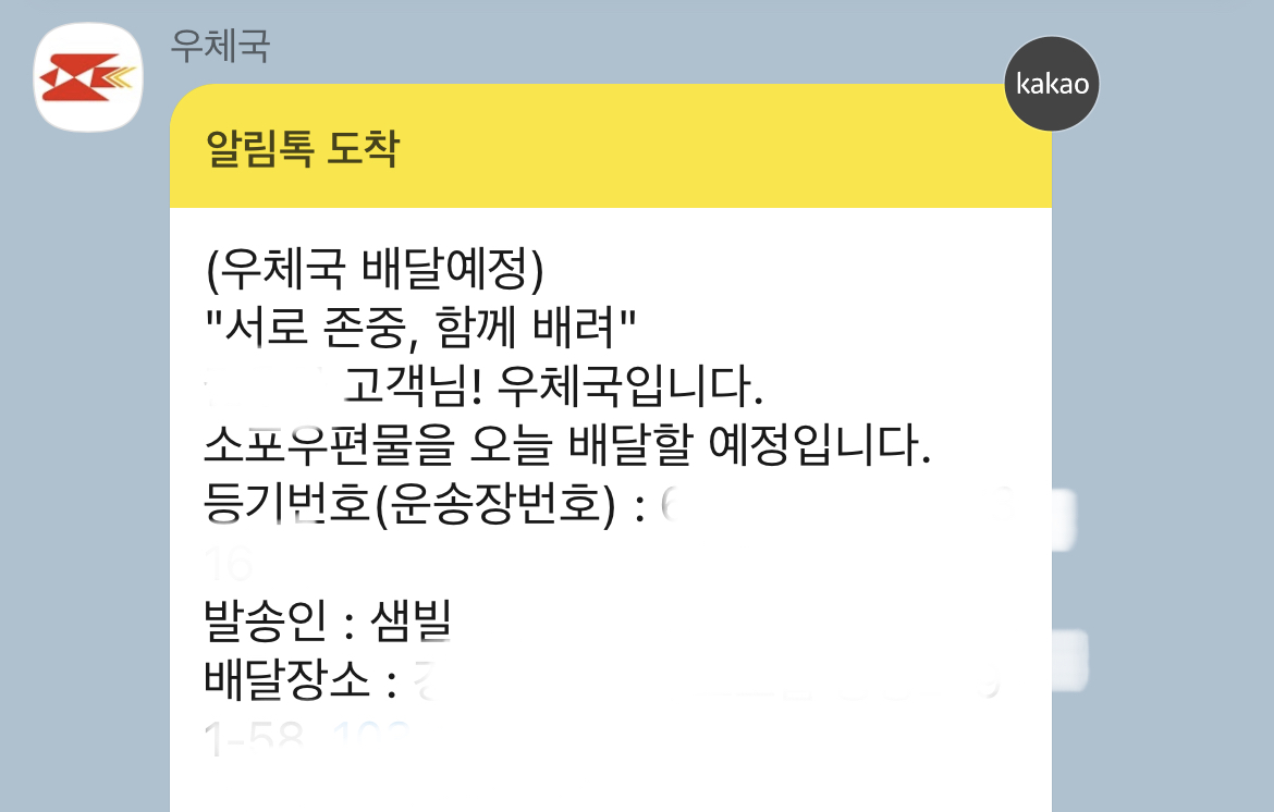 언제 봐도 좋은 택배 도착카톡! 이제는 익숙한 저 샘빌님.. 보자마자 아 카페에서 응모했던 체험단이 당첨됐구나 싶었다.