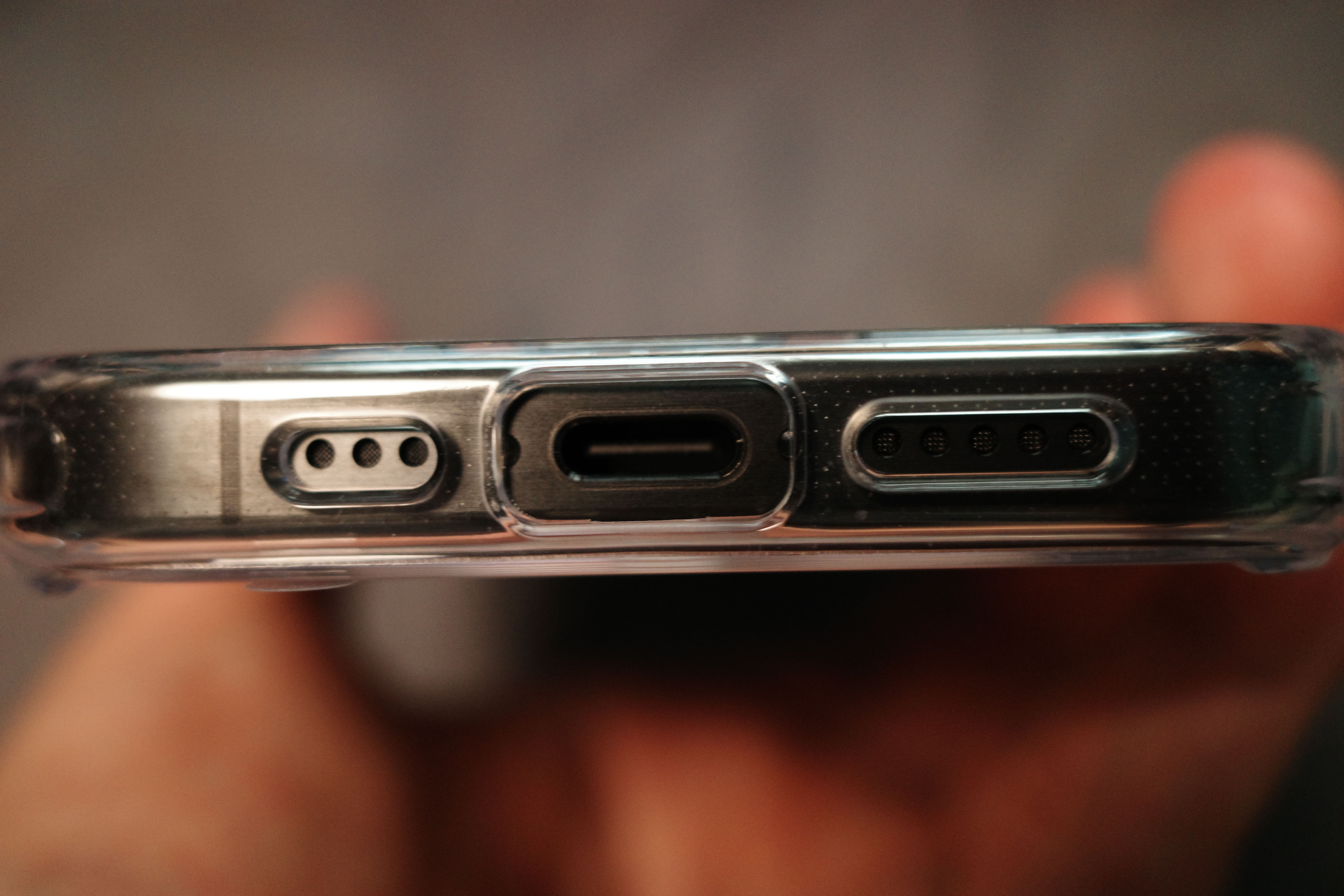 스피커 구멍 및 충전단자 부근은 잘 맞춰 뚫려있으며 충전단자 부근을 조금 더 크게 뚫어 조금 두꺼은 USB-C타입의 충전선도 연결 가능하게 되어있습니다.