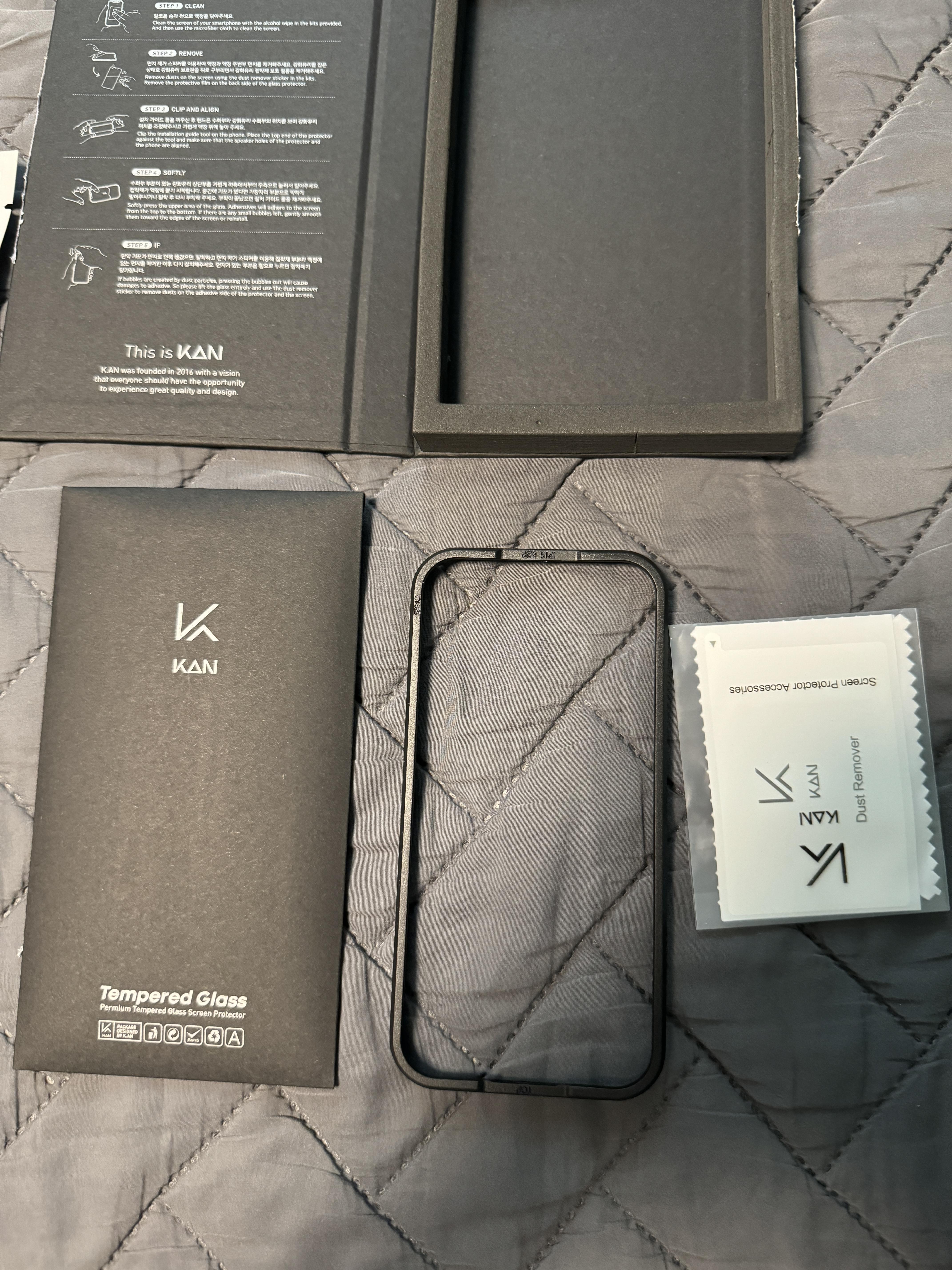 J사의 제품 중 너무나도 간편하게 부착가능한 강화유리 제품이 있었기에..(폰을 알콜스왑으로 닦은 후 강화유리를 상단 케이스에 넣고 제품의 손잡이를 당기면 내부 스티커를 통해 먼지가 제거되면서 바로 부착되는 방식, 위 사진엔 강화유리는 없습니다.) KAN도 비슷한 부착방법을 사용해준다면 더욱 빠르고 쉬운 부착이 가능할 것 같습니다.