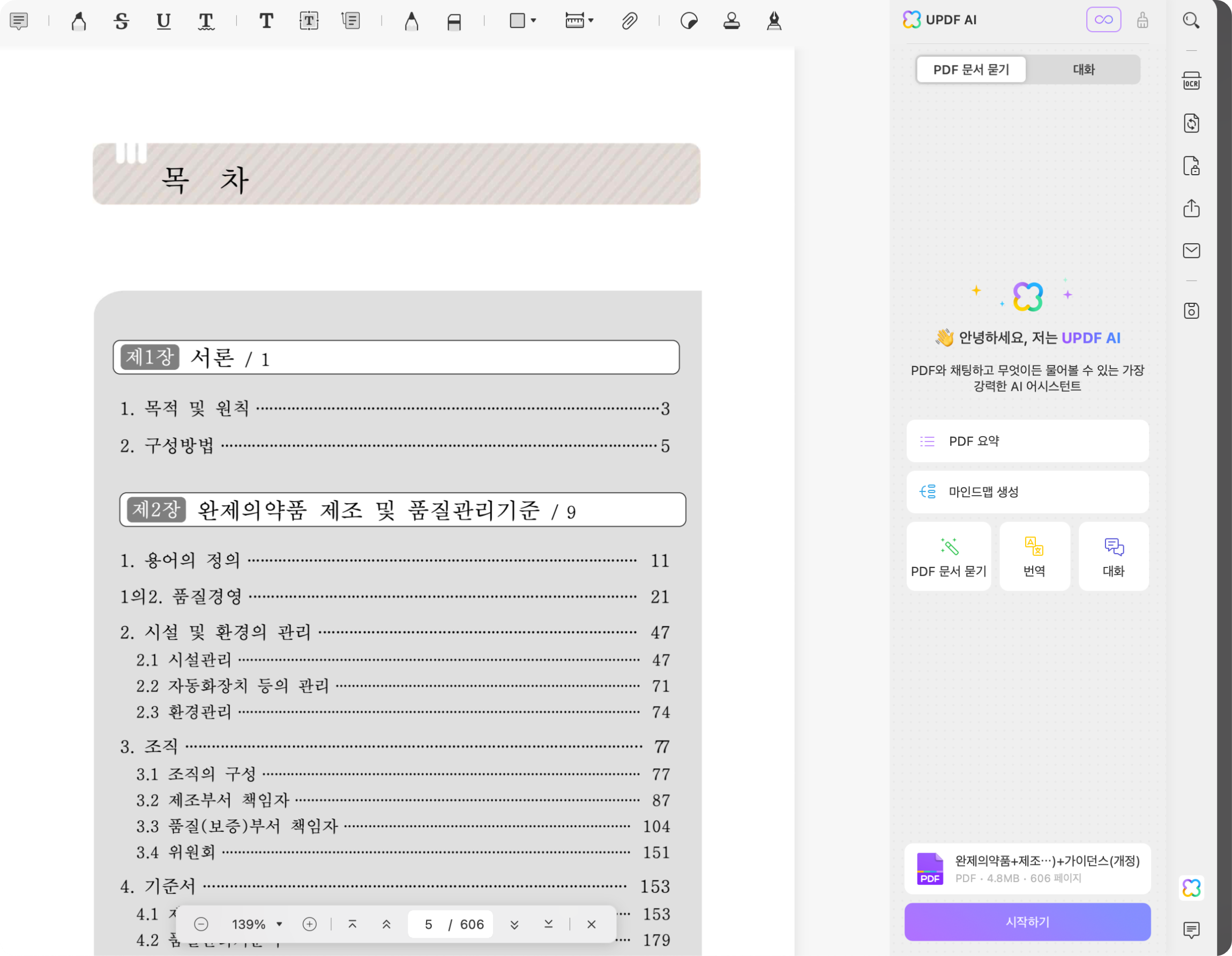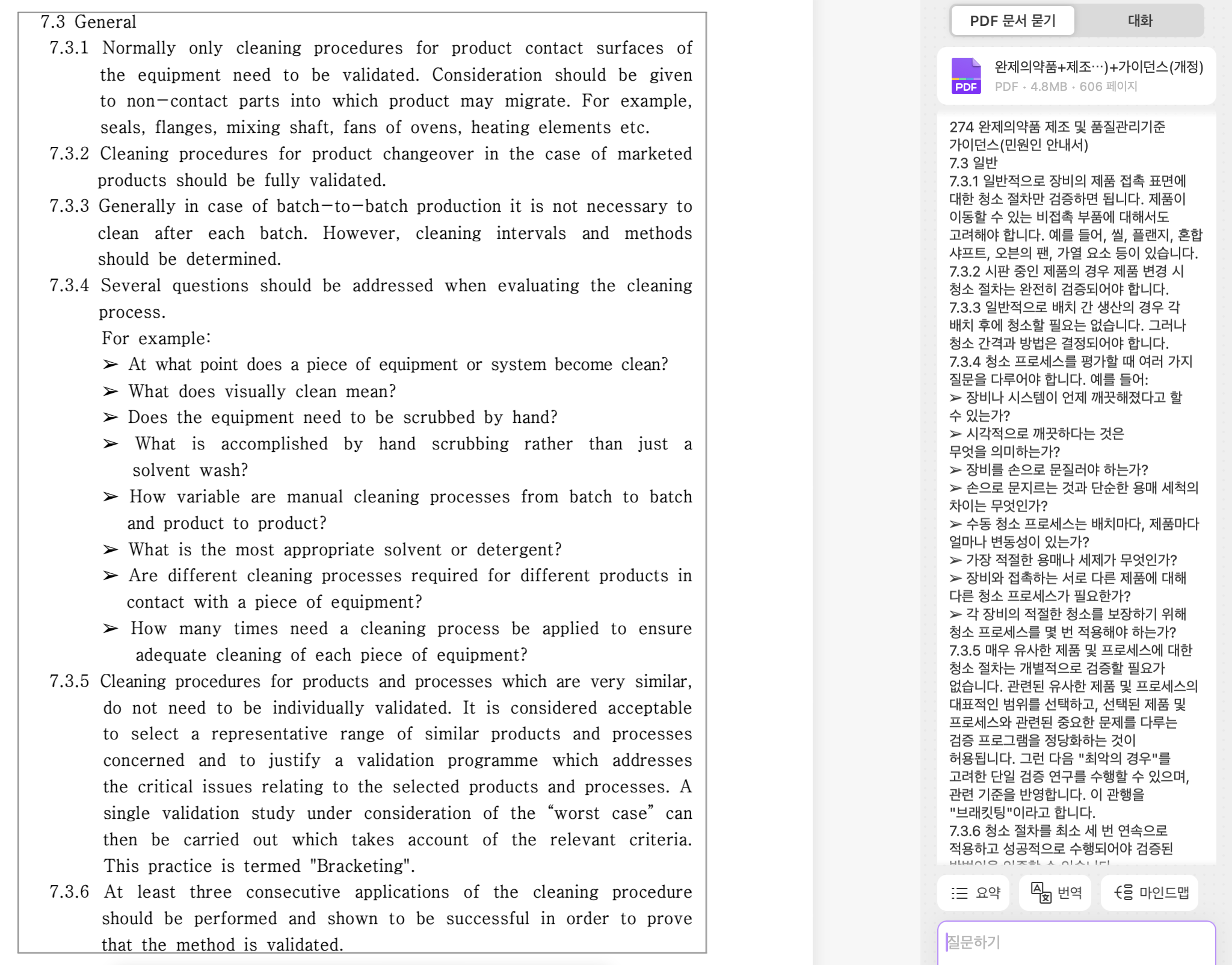누구나 자주 보는 식품의약품안전처에서 발간한 완제의약품 제조 및 품질관리 기준 가이던스 PDF로 AI기능을 시험해보려고 실행시켜봤다.