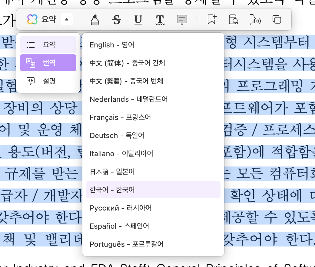 AI기능으로 블록친 곳만 요약, 번역, 설명이 가능하다.