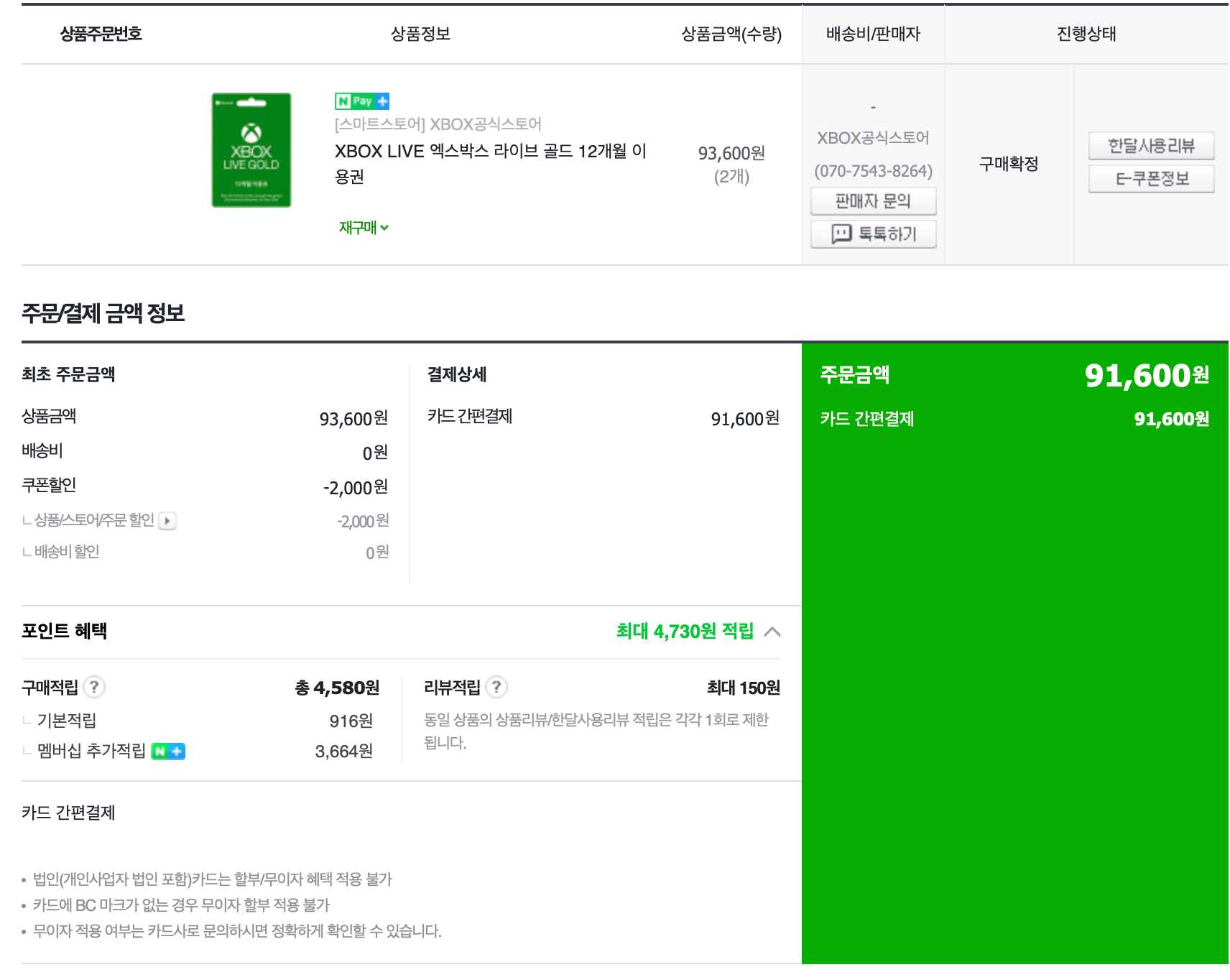 일단 Xbox Live Gold를 검색하여 구매한다. 나는 네이버 Xbox공식스토어에서 구매했다. 네이버 플러스를 이용중이라 적립금도 주고, 어차피 가격은 다 비슷비슷 하기에. 해외구매로 조금더 저렴하게 이용하는 방법이 있다곤 하지만 가격차이가 크지않고 귀찮음은 크기에 정식구매로 구매했다.